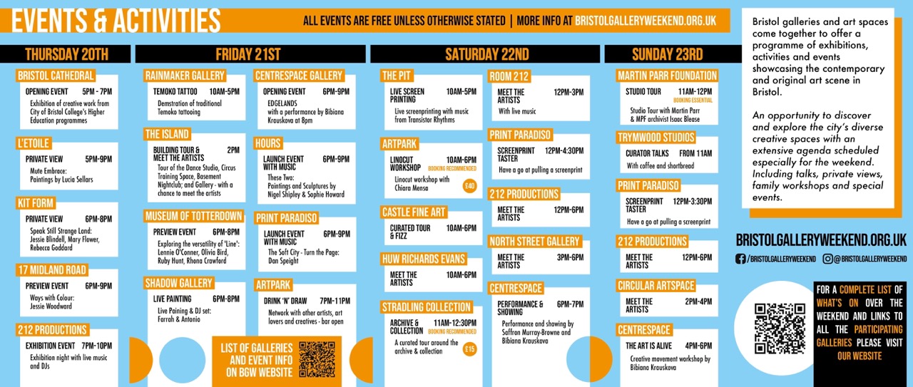 Showcasing the contemporary art scene in Bristol with a rich programme of events at a variety of art spaces, galleries, artist run projects and private art collections.